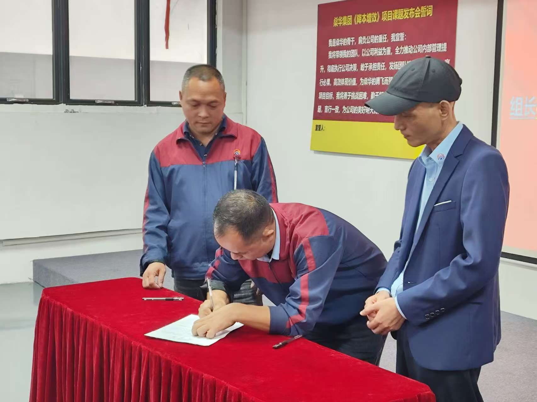 至此,项目从决策到执行的组织体系全面建立,权责清晰,重任在肩。 三、承诺于心,担当于行 在目标承诺环节,各改善小组负责人依次上台,郑重签署课题目标承诺书。每一笔签名,不仅代表对目标的公开承诺,更承载着对成果的责任与担当,展现出团队使命必达的决心。