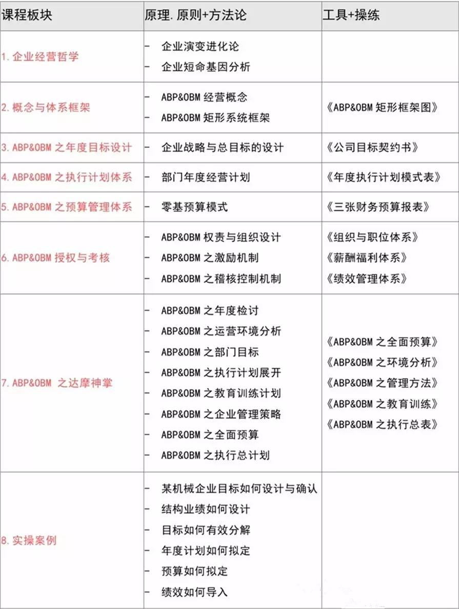 【思博课程特色——结果导向】 1、“年度经营计划”帮助企业直达经营目标(业绩、毛利、准交、品质、人效等) ; 2、“年度经营计划”已帮助企业150多家企业实现业绩40%增长; 3、“年度经营计划”帮助企业建立以绩效为导向的正文化; 4、“年度经营计划”帮助企业形成规划化运作“年度经营计划”帮助企业建立数据化管理; 5、“年度经营计划”帮助解放企业老板;
