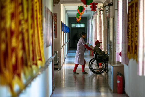 在一家敬老院,一名护理员用轮椅推着一名老人上电梯(2013年10月3日摄)。新华社发 来源:参考消息网 图片来自网络 |