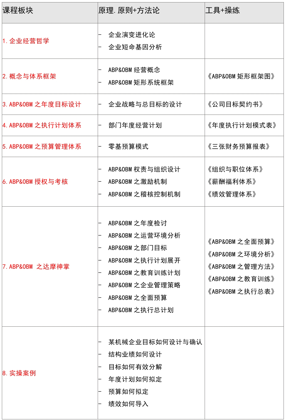 六、课程安排 主题:思博商学院 | 《职业总经理训练营》系列课程之《年度经营计划与全面预算管理》 时间:2016年10月22日(周六) 9:30-12:00 14:00-18:00 地址:东莞东城设计师酒店13楼蔚蓝厅 (东城万达广场斜对面) 联系人: 张先生(137-2867-1688) 深圳市思博企业管理咨询有限公司 年度经营计划与全面预算管理(ABP&OBM)落地供应商